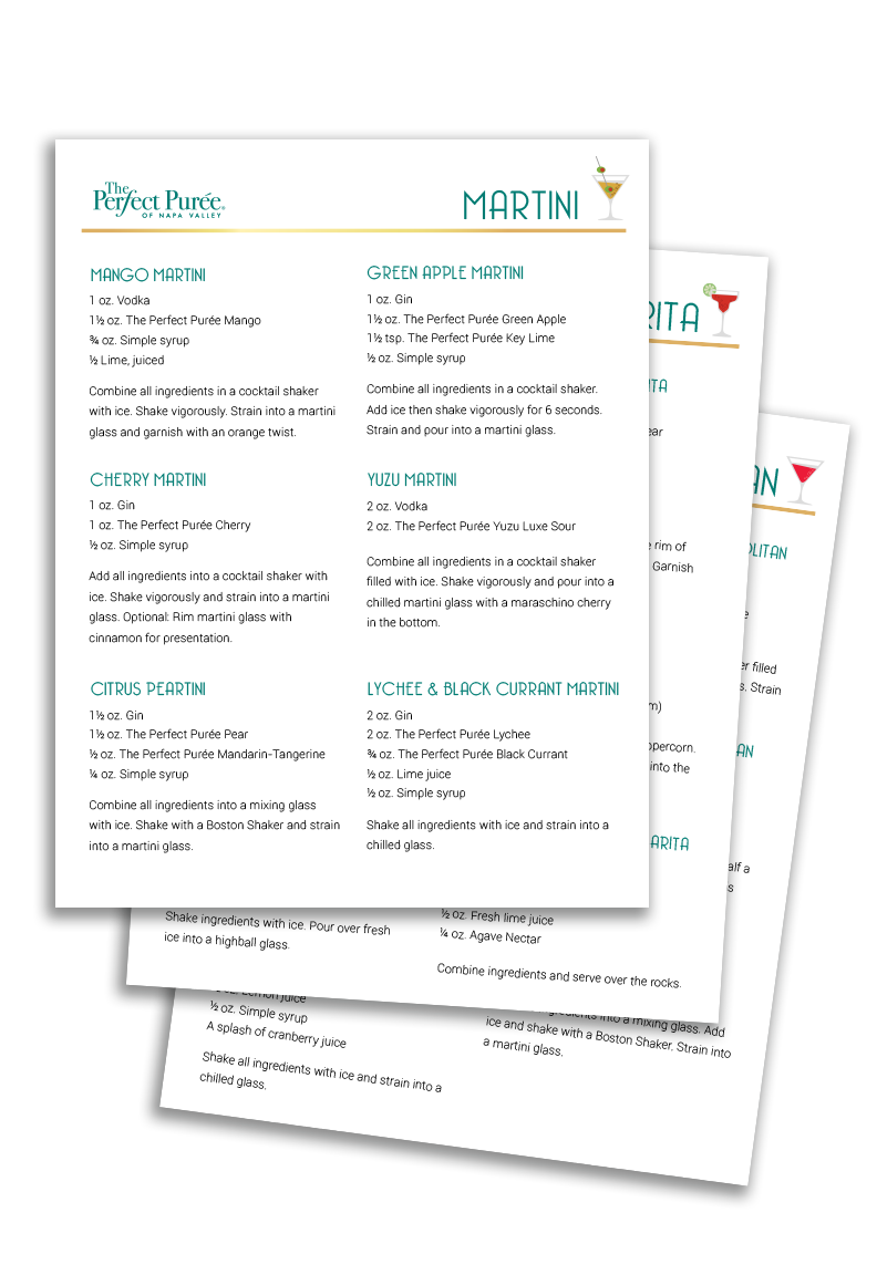 Downloadable Classic Cocktail Guide Classic Cocktails Download your free 9-page recipe guide with 42 classic cocktail recipes featuring The Perfect Purée. Download Guide Now Including Recipes for: Martinis Negronis Sidecars Cosmopolitans Daiquiris Margaritas Mojitos Juleps Mules Tom Collins Download Guide Now