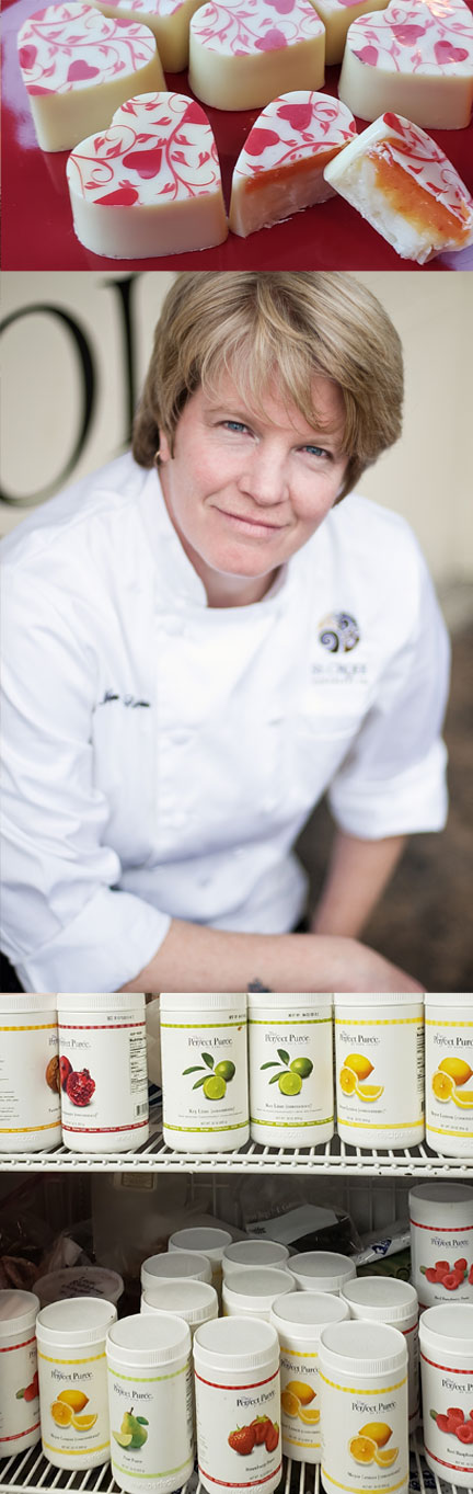 She recently introduced a line of caramel sauces in five flavors including Peppered Passion Fruit with The Perfect Purée Passion Fruit Concentrate. She adds undiluted Meyer Lemon Concentrate to chocolate ganache and rolls it in espresso sugar.