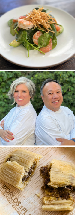 Laura and Eric partnered with The Perfect Purée for the 2024 Worlds of Flavor Conference at the CIA at Copia in Napa. The theme, “Borders, Migration, and the Evolution of Culinary Tradition,” asked chefs from every corner of the globe to reflect on how ingredients migrate with people from one continent to another. The Lees turned to three cross-cultural flavors, Coconut, Tamarind, and Red Jalapeño for their Madras Lamb Curry Coconut Tamale.