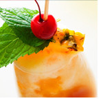 Add ice and mix in a shaker with fresh ice. Shake and strain over fresh ice. Sink Cranberry Puree to the bottom of the glass. Garnish with a pineapple spear and cherry.