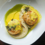 Serve crab cakes next to a pool of Mango-Champagne Sauce then drizzle with chili and cilantro oil. |