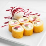 Pour 4 oz. of Passion Fruit Mango Sauce in a deep dish. Decoratively arrange the 6 pieces from one sushi roll over the sauce. Garnish with mint and serve. |