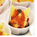 Arrange 2 triangles of pastry bread in small sample cup, tilted upright so points are on top.