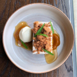 Beat Cream Cheese Ermine until fluffy. Frost the Molasses Cake with a ¼-inch layer and freeze for at least 1 hour. Once frozen, cut into 3.5-by-2.5-inch portions using a hot knife. On each plate, pipe a few dots of Camu Camu–Pumpkin Butter and place a piece of cake slightly off-center. Top with Cookie Crumb Streusel and add a scoop of Coconut Sherbet. Drizzle Pineapple Reduction onto the plate, allowing it to run into the Camu Camu. Garnish with Mexican mint marigold.
