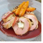 | 3. | Clean pork tenderloin, butterfly and pound it thin, add the stuffing to the center and roll like a cigar. Rub with the meat with the salt, pepper, sage. Wrap tenderloin with pancetta. |