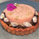 - Finish tartlet with pistachios sable, edible gold, and edible flowers.