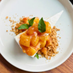 I have chosen to create a bright and light semifreddo with the White Peach Puree from Perfect Puree. It is essentially a play on peaches and cream but mousse and light as air. I’ve incorporated fresh diced yellow peach as well for brightness and acidity and for a fun textural element. The semifreddo sits on a bed of almond shortbread crumble.